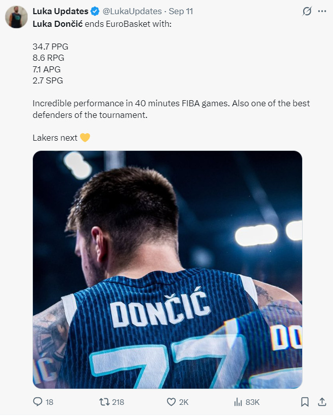 湖人媒体写道:距离东契奇与洛杉矶湖人队合训只剩下18天。换言之东契奇还有18天的时间来休整,他应该还有一些斯洛文尼亚的活动要进行。